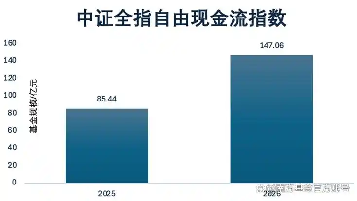 据wind数据统计,自由现金流主题被动指数型基金已经从2025年的85.44亿元增长到2026年的147.06亿元,规模不断攀升。