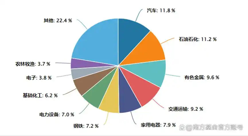 汽车、石油石化、基础化工、有色金属、交通运输,合计权重52.42%,虽然前五大行业权重过半,但没有任何单一行业权重超过12%,避免了过度集中于单一赛道的风险。