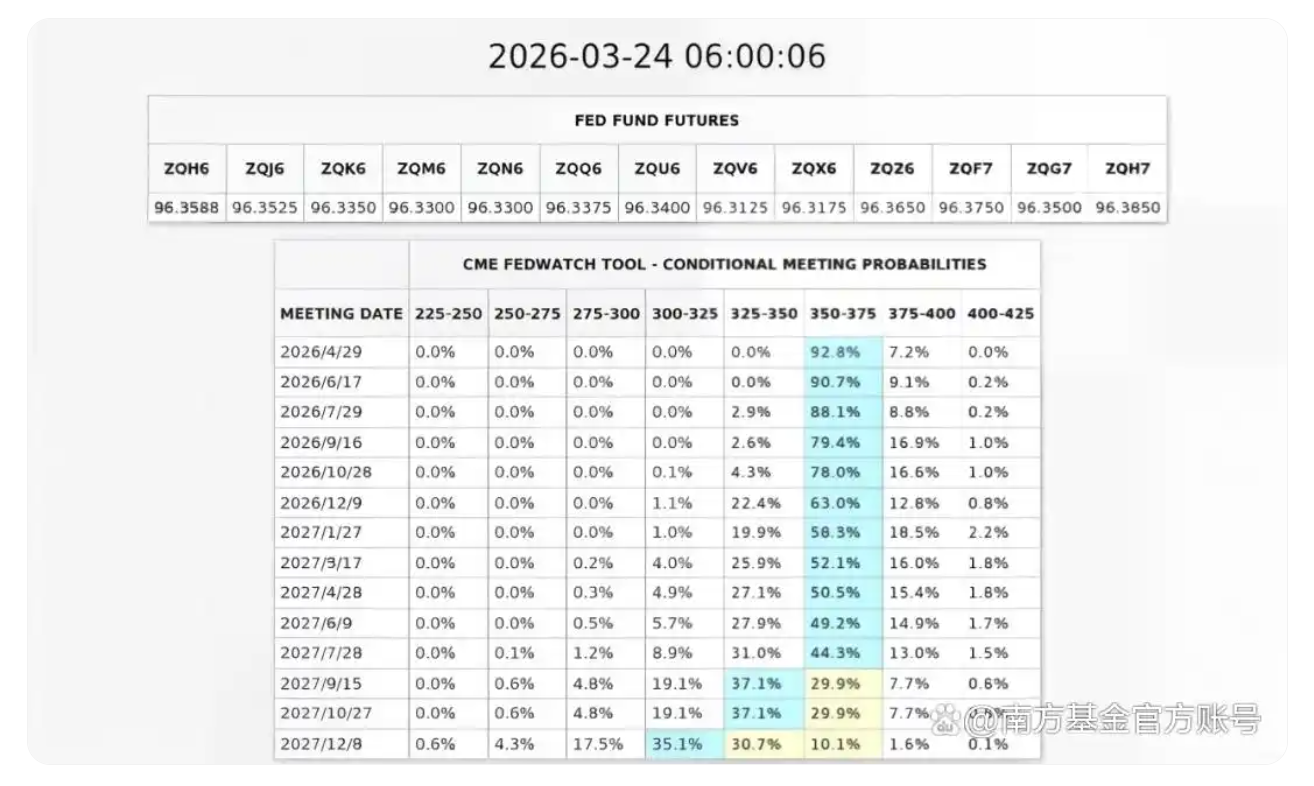 数据来源:Fedwatch Tools。基于芝商所联邦基金利率期货价格计算而来,呈现市场对美联储未来加息、降息或维持利率不变的概率预期。